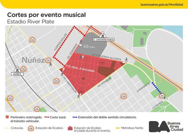 En esta nota, el detalle de todos los cortes, desvíos y cómo llegar en transporte público al Monumental, tal como detalló la Secretaría de Transporte y Obras Públicas porteña.
