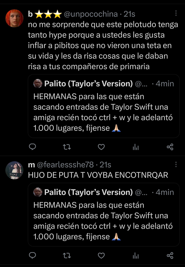 Millones de argentinas pasaron algunas horas en la "cola virtual" para poder conseguir un ticket para el show, por lo que la jugada del usuario @xmilianx_, conocido como "Palito", derivó en un fuerte repudio de las fanáticas de la artista estadounidense.