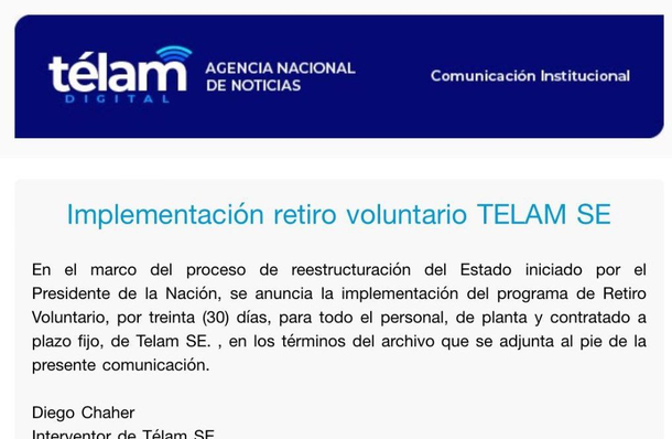 "En el marco del proceso de reestructuración del Estado iniciado por el Presidente la Nación, se anuncia la implementación del programa de Retiro Voluntario por 30 días, para todo el personal, de planta y contratado a plazo fijo, de Télam SE, en los términos del archivo que se adjunta al pie de la presente comunicación", dice el comunicado.