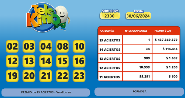 El nuevo millonario en su boleta tenía -tiene- los siguientes números: 08 - 04 - 13 - 10 - 12 - 03 - 22 - 02 - 16 - 21 - 23 - 19 - 14 - 20 - 15 y así ganó $437.369.379.