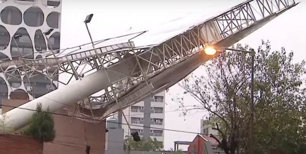 Los fuertes vientos derribaron un enorme cartel publicitario en el barrio porteño de Caseros. La caída provocó destrozos en cuatro casas. La enorme columna que sostiene al aviso aplastó el techo de una vivienda e hizo derrumbar el garage de otro inmueble.
