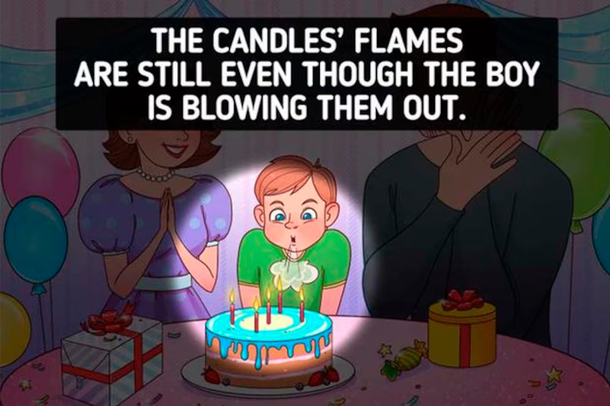El objetivo de este tipo de acertijos es detectar errores o inconsistencias en imágenes que, a primera vista, parecen completamente normales. En este caso, la ilustración muestra a una familia celebrando el cumpleaños de un niño. Hay velas encendidas en la torta, regalos y muchas sonrisas, pero un detalle rompe con las leyes de la física y hace que algo no tenga sentido.
