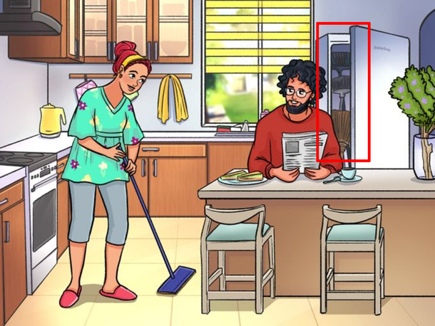 El error en la cocina es que las escobas están guardadas en la heladera. Si lo descubriste en 7 segundos formás parte de un grupo selecto de grandes observadores.