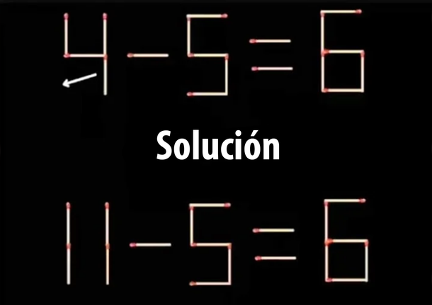 El único movimiento a realizar está relacionado con el número 4. Debes mover un fósforo para transformarlo en el número 11. De este modo, la resta quedaría así: 11 - 5 = 6.