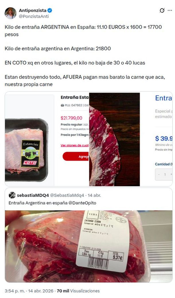 Un detalle no menor es que si se convierten 11,10 euros a pesos al final de esta jornada, mares 15 de abril de 2026, el kilo de entraña argentina en España está a $ 17,797, un precio cercano al kilo de vacío o de cuadril en el mismo supermercado citado en los tuits.