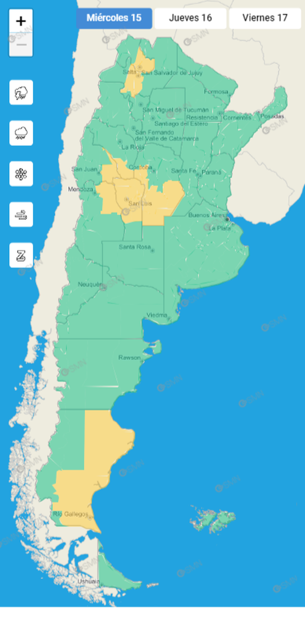 Las provincias de Córdoba, Entre Ríos, La Rioja, Mendoza, Salta, San Juan, San Luis y Santa Fe se encuentran bajo alerta amarillo por tormentas fuertes para la jornada de este miércoles, con ocasional caída de granizo y actividad eléctrica, informó el Servicio Meteorológico Nacional.