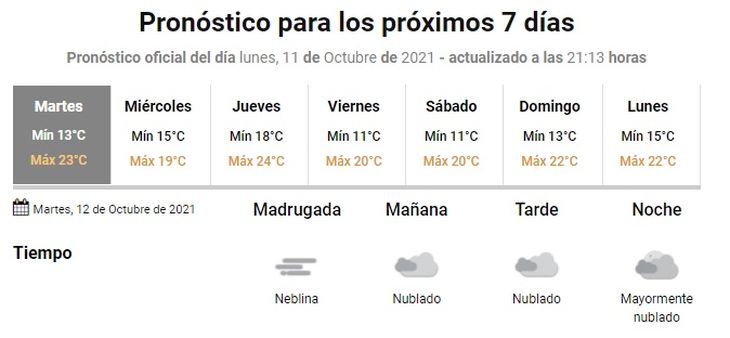 En este marco, se espera una jornada con neblina en la madrugada y cielo nublado durante todo el día, mientras que la temperatura oscilará entre 13 y 23 grados.