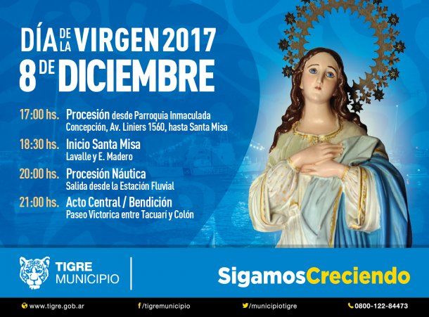 El Municipio de Tigre prepara su tradicional festejo para el próximo 8 de diciembre, fecha en que se celebra el Día de la Virgen. Como cada año, se espera que miles de personas participen del tradicional homenaje a la Inmaculada Concepción, con una Santa Misa y la clásica procesión náutica sobre el Río Luján.