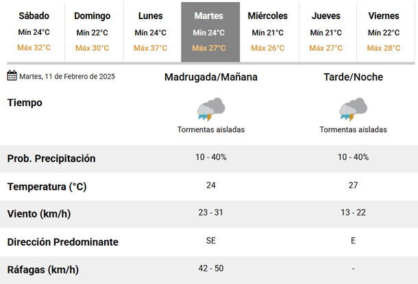 De esta manera, la temperatura máxima descenderá a los 27 grados, marcando un significativo cambio respecto del día anterior. Por la mañana, el viento soplará desde el Sudeste y se esperan ráfagas de hasta 50 kilómetros por hora.