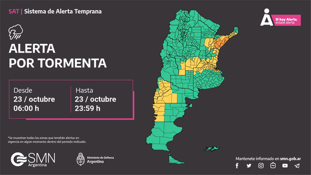 Para las provincias de Santa Fe, Córdoba, San Luis, Entre Ríos, Buenos Aires, Neuquén, Río Negro y Chubut, hay alerta amarilla. Estas zonas se verán afectasas por tormentas intensas. "Las cuales estarán acompañadas por intensas ráfagas, fuerte actividad eléctrica, caída de granizo y abundante caída de agua en cortos períodos. Se estiman valores de precipitación acumulada entre 20 y 50 mm, pudiendo ser superados en forma puntual", explicaron desde el SMN.