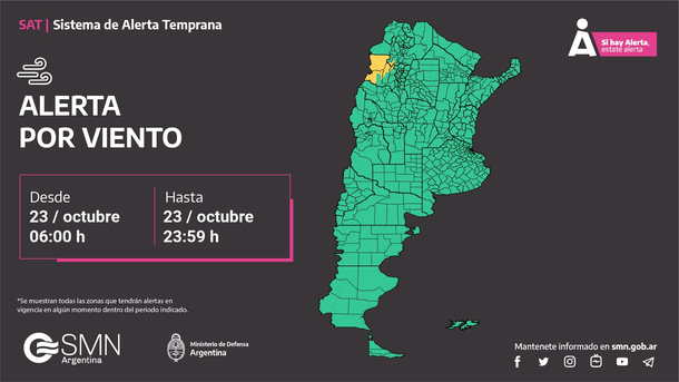 Mientras que para La Rioja, Catamarca rige una alerta meteorológica amarilla por "vientos del sector oeste con velocidades entre 50 y 75 km/h y ráfagas que pueden alcanzar los 90 km/h, pudiendo ser superadas localmente, con las mayores intensidades en las zonas más elevadas".