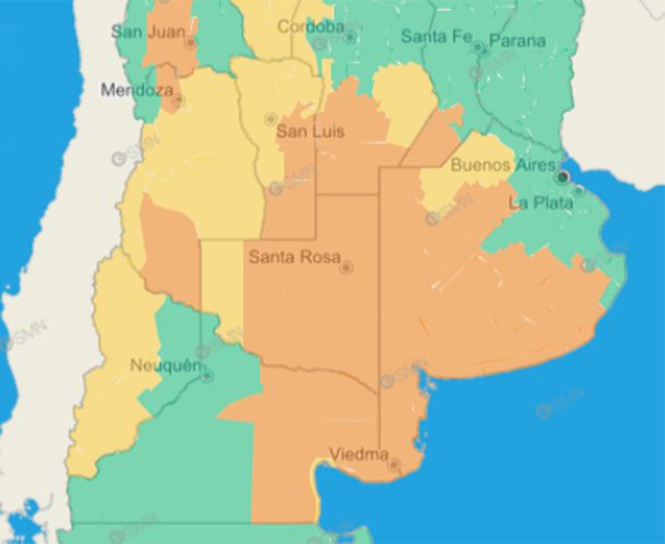 En San Luis, la mitad de la provincia está bajo alerta naranja, en Gobernador Dupuy y la zona baja de Coronel Pringles y de General Pedernera; y la parte amarilla es para la zona baja de Ayacucho, de Belgrano, de Juan Martín de Pueyrredón, de Chacabuco, de Junín y de Libertador General San Martín.