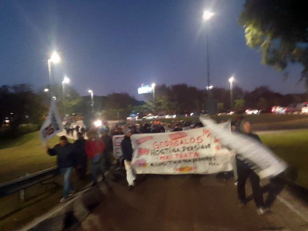 Los trabajadores de la planta de Georgalos en San Fernando, provincia de Buenos Aires, realizan una manifestación este miércoles en la Autopista Panamericana, luego de que la empresa despidiera a cinco empleados y eliminara el bono por productividad.