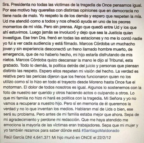 "Sra. Presidenta (sic) no todas las víctimas de la tragedia de Once pensamos igual. Por ese motivo hay querellas con distintas opiniones que en democracia no tiene nada de malo”, consideró el papá de Alberto, una de las 51 víctimas. A su vez, destacó: “Ud. me atendió como a todos y nos ofreció ayuda en uno de los peores momentos de mi vida. Pero sin prensa. Algo que quedó entre Ud y los que ahí eso tuvimos".
