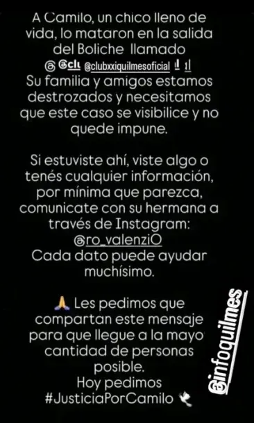 En sus historias de Instagram, la hermana del joven hizo un emotivo y contundente descargo. "A Camilo, un chico lleno de vida, lo mataron a la salida del boliche. Su familia y amigos estamos destrozados y necesitamos que este caso se visibilice y no quede impune", comienza diciendo.