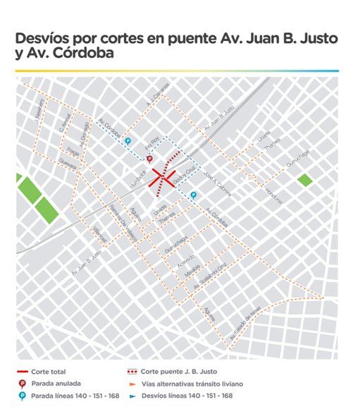 -140 (Correo Central/Boulogne), 151 (Constitución/Puente Saavedra) y 168 (Constitución/Puente Saavedra) se desviarán por av. Córdoba, Godoy Cruz, Cnel. J. A. Cabrera, Fitz Roy y retomarán en av. Córdoba.
