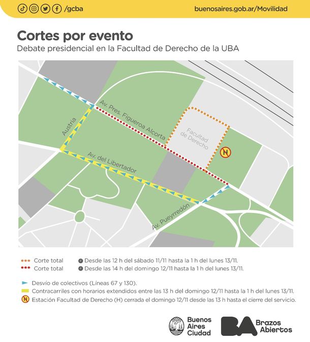 El último debate presidencial se realizará el próximo domingo 12 de noviembre en la Facultad de Derecho de la UBA, en la Ciudad de Buenos Aires. Por este motivo se realizarán afectaciones al tránsito durante el fin de semana que implicarán desvíos alternativos a la av. Figueroa Alcorta, la extensión horaria del contracarril de la av. Del Libertador, y el cierre de la estación de subte Facultad de Derecho de la Línea H.
