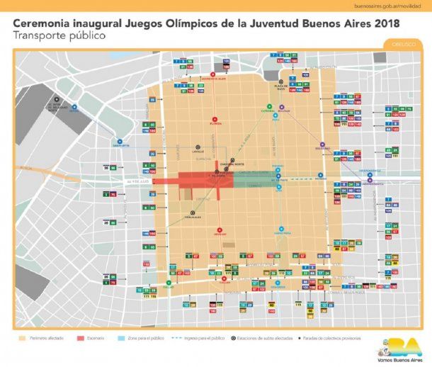 Continúan algunos cortes de tránsito en los alrededores del Obelisco por la fiesta inaugural de los Juegos Olímpicos de la juventud. El Metrobus de la 9 de Julio volverá a correr desde la madrugada del lunes pero en los carriles centrales de la avenida habrá algunos desvíos, y tampoco se podrá pasar por Corrientes hasta que se desarme el escenario.
