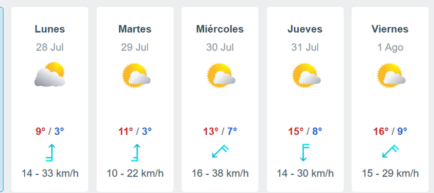 Esta semana las marcas térmicas seguirán siendo agradables menos el miércoles 23 de julio, día en que se espera una temperatura mínima de apenas 3 grados pero será la excepción a la regla porque luego el clima volverá a estar con clima primaveral.