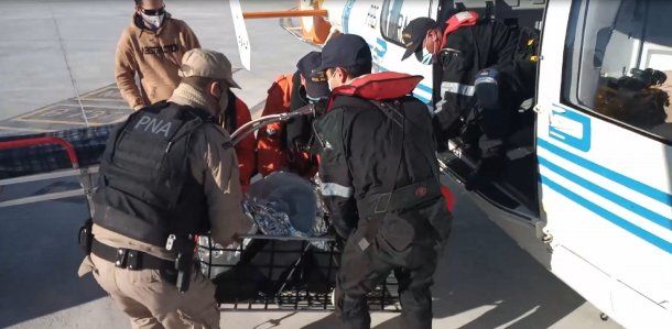 Con la médica y nadadores de rescate a bordo se posicionaron sobre el buque, el personal descendió una canasta sanitaria e izó al tripulante, quien recibió las primeras asistencias a bordo. Al mismo tiempo, se coordinaba el arribo de una ambulancia al aeropuerto de la ciudad de Trelew.