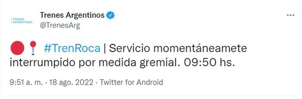 El incidente fue en la estación Temperley y ya rige la medida de fuerza.