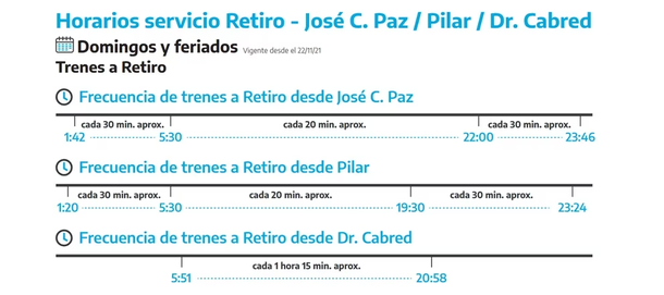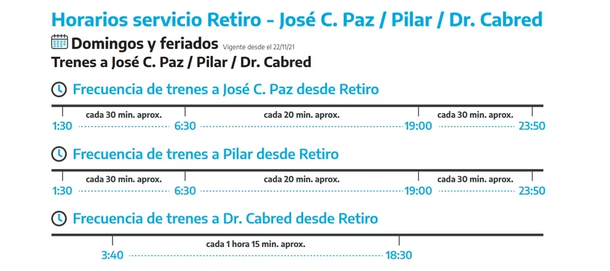 Desde ese horario hasta las 20:24, cada tren vuelve a salir cada media hora. Los que parten de la estación Dr. Cabred, lo hacen cada una hora y cuarto, y lo mismo sucede en el sentido contrario.