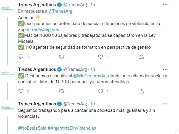 Con los hashtag #NoEstásSola y #ArgnetinaSinViolencias, Trenes sostuvo que "seguimos trabajado para alcanzar una sociedad igualitaria y sin violencias".