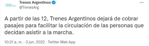 Es por este motivo que la empresa comunicó que "a partir de las 12, Trenes Argentinos dejará de cobrar pasajes para facilitar la circulación de las personas que decidan asistir a la marcha".