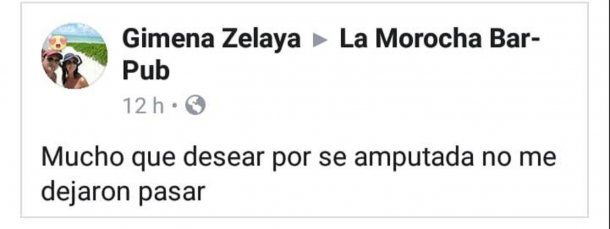 Unos minutos después Gimena dio la espalda, sacó su teléfono celular y mandó un mensaje público al perfil de Facebook del boliche: “Mucho que desear. Por ser amputada no me dejaron pasar”.
