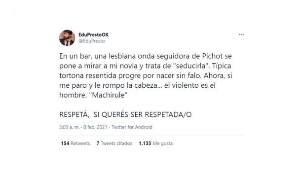 Lo "políticamente incorrecto" puede ser expresado con buen gusto, pero en el caso de Prestofelippo dos días antes de ser elogiado por Patricia Bullrich, en la madrugada del 8 de febrero, al mejor estilo Donald Trump dejó correr toda su lesbofobia cuando salió a un bar con su novia y otra mujer intentó "seducirla", según él.