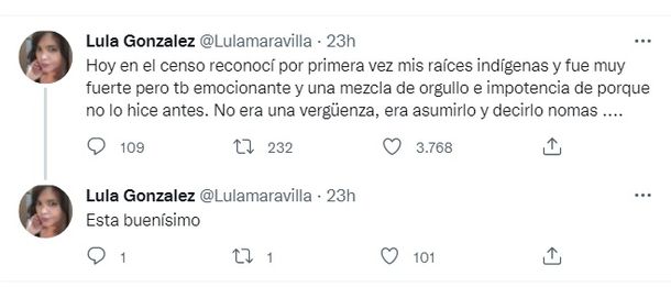 “Hoy en el Censo reconocí por primera vez mis raíces indígenas y fue muy fuerte pero también emocionante, y una mezcla de orgullo e impotencia de porque no lo hice antes. No era una vergüenza, era asumirlo y decirlo nomás”, escribió Lula González, quien se describe en su biografía como “Periodista con perrites” y vive en la Ciudad de Buenos Aires.