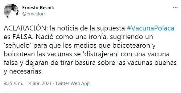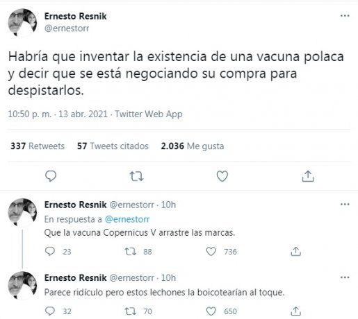 “Habría que inventar la existencia de una vacuna polaca y decir que se está negociando su compra para despistarlos”, propuso el biólogo molecular y biotecnólogo, Ernesto Resnik, un reconocido científico que en Twitter tiene 61 mil seguidores.
