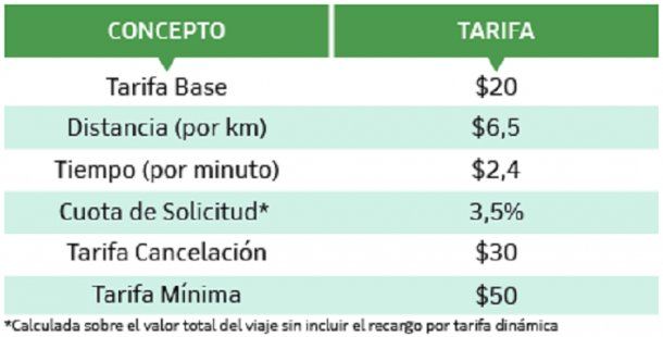 Uber informó que su nueva tarifa base será de 20 pesos, más 6,5 pesos por kilómetro y 2,4 pesos por minuto de espera, en tanto que cobrará un mínimo de 50 pesos y 30 pesos por viaje cancelado.