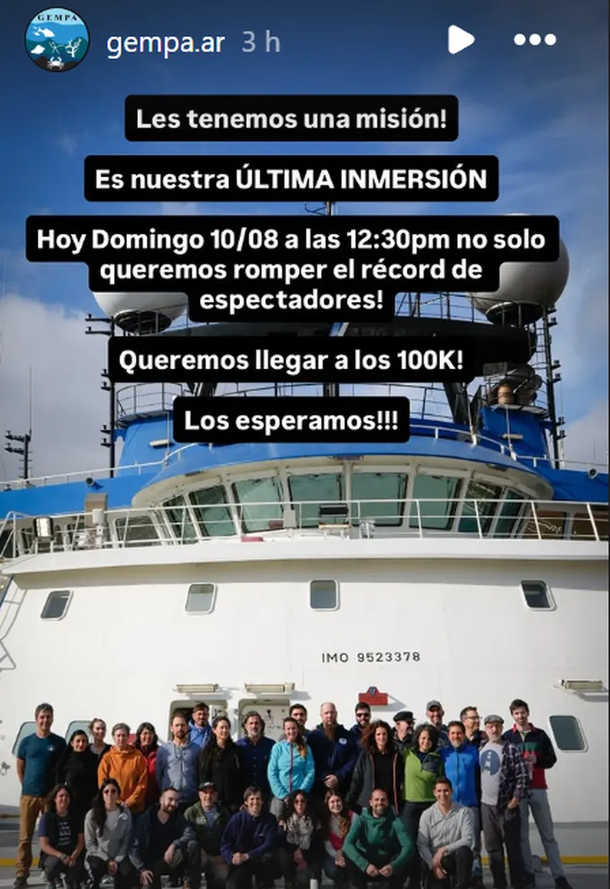 A través de su cuenta de Instagram, los científicos del GEMPA hicieron un llamado a la audiencia para su última transmisión: "¡Les tenemos una misión!". Con la emoción a flor de piel, convocaron a los fanáticos: "Es nuestra última inmersión. Hoy domingo 10 de agosto a las 12:30 no solo queremos romper el récord de espectadores, queremos llegar a los 100.000. ¡Los esperamos!".