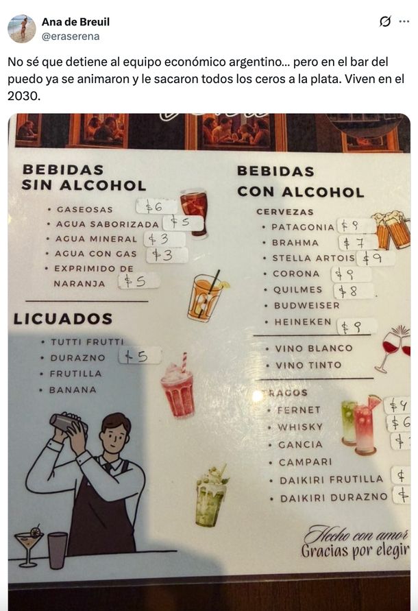 "No sé qué detiene al equipo económico argentino… pero en el bar del pueblo ya se animaron y le sacaron todos los ceros a la plata. Viven en el 2030", escribió la joven junto a la imagen que rápidamente acumuló miles de interacciones. En el menú, productos que habitualmente rondan los $6.000 aparecen listados simplemente como $6.