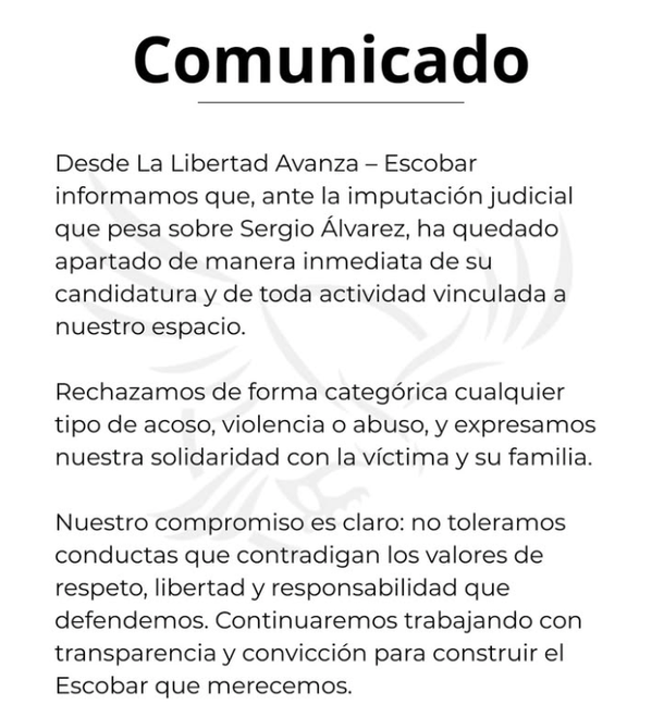Luego del allanamiento y la imputación, desde el espacio de La Libertad Avanza en Escobar difundieron un comunicado donde informaron que Álvarez “ha quedado apartado de manera inmediata de su candidatura y de toda actividad vinculada a nuestro espacio”.