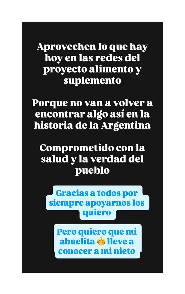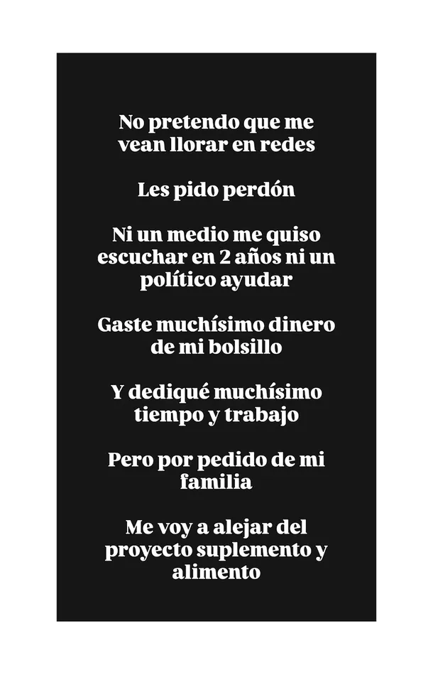 "Porque dice que con el Proyecto Suplementos me mandaban un mensaje", intentó explicar el influencer, quien luego aclaró por escrito que lleva dos años lidiando con la desagradable reacción de las empresas que comercializan los sumplementos.