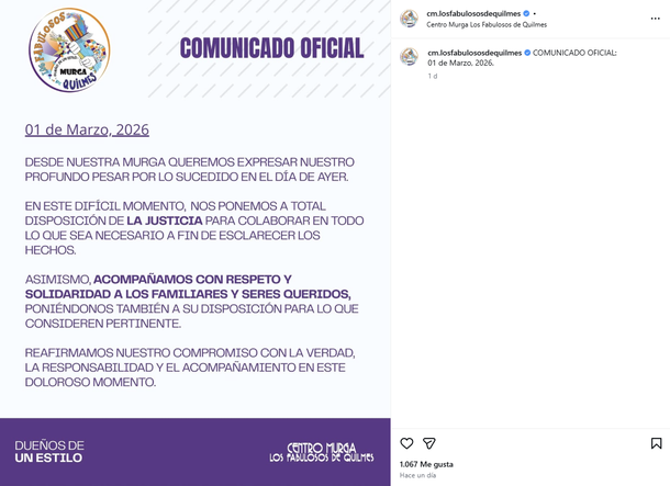 "Asimismo, acompañamos con respeto y solidaridad a los familiares y seres queridos, poniéndonos también a su disposición para lo que consideren pertinente. Reafirmamos nuestro compromiso con la verdad, la responsabilidad y el acompañamiento en este doloroso momento", completaron desde el Centro Murga Los Fabulosos de Quilmes en Instagram.