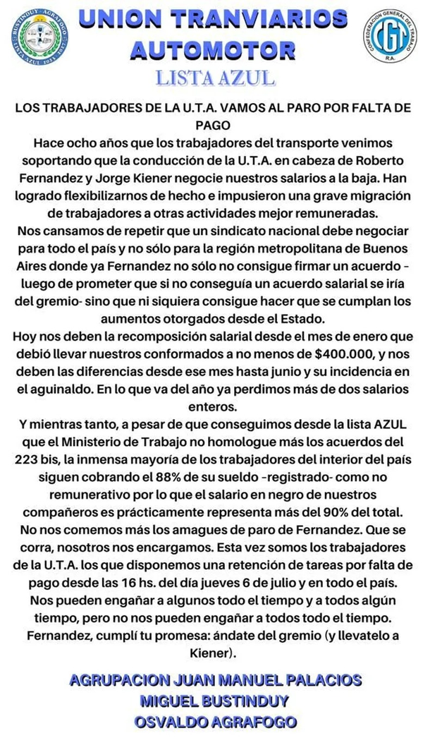 En un comunicado, explicaron: "Hace ocho años que los trabajadores del transporte venimos soportando que la conducción de la UTA, encabezada por Fernández, y Jorge Kiener negocie nuestro salarios a la baja".