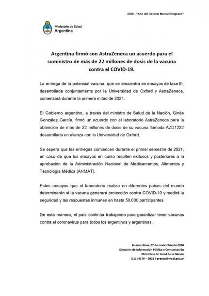 El laboratorio que desarrolló junto a la Universidad de Oxford esta vacuna emitió un comunicado que fue difundido por el Gobierno para dar a conocer el acuerdo que permitiría la adquisición de esa vacuna "en caso de que los ensayos en curso resulten exitosos".