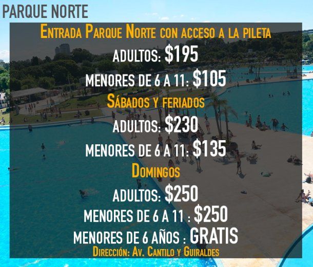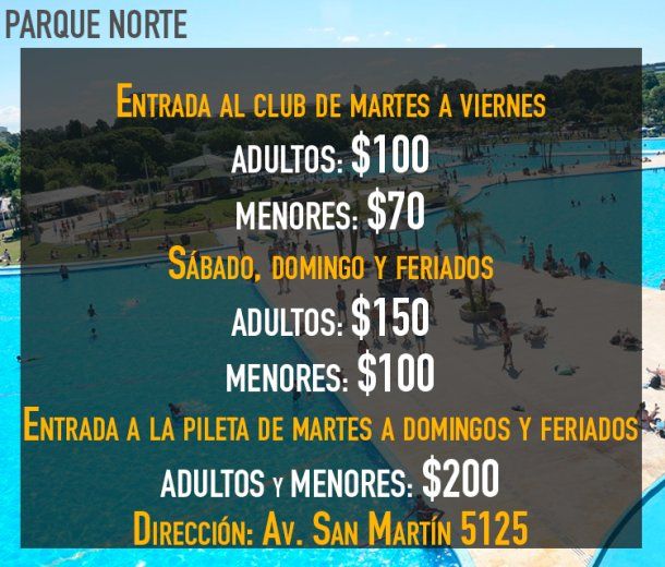 El complejo Parque Norte cuenta con tres piletas de más de 4.500 metros cuadrados cada una, toboganes de agua, actividades recreativas en el agua con coordinadores y aquaplay. Además, hay 16 canchas de tenis, diez sintéticas y de arena de fútbol, cuatro de paddle y un gimnasio.