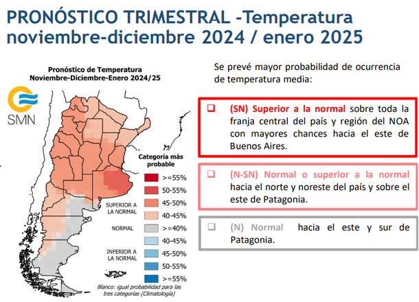 El informe del SMN indica que la zona donde hará más calor es en la provincia de Buenos Aires donde se espera una temperatura "superior a la normal sobre toda la franja central del país y región del NOA con mayores chances hacia el este".