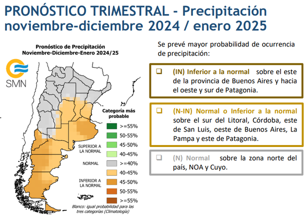 En tanto, respecto a las lluvias el organismo oficial indica que para casi la misma zona se espera menos precipitaciones en los próximos 3 meses, sobre todo durante en enero en este verano 2025 que se viene en la Argentina.