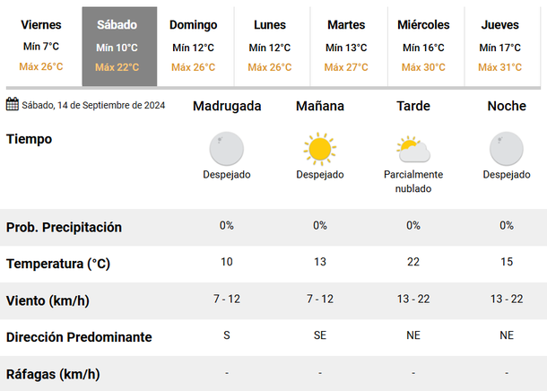 El fin de semana tendrá temperaturas similares y el cielo estará despejado por momentos, y parcialmente nublado por otros. En tanto, el viento dejará soplar desde el Sur y virará hacia el Norte.