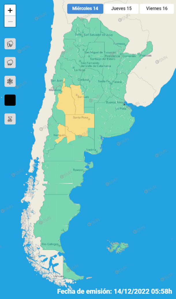 La alerta también se extendía hacia la provincia de Mendoza, con la excepción de la zona cordillerana, y a un sector del sur de San Juan que incluía la capital provincial y las ciudades de 9 de Julio, Albardón, Chimbas, Rawson, Santa Lucía, la zona baja de Pocito, Rivadavia y Sarmiento, indicó el Servicio Meteorológico Nacional.