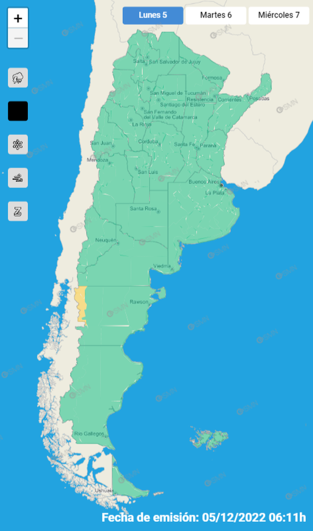 El Servicio Meteorológico Nacional pronosticó otra alerta amarilla por lluvia para la cordillera de Chubut en las zonas de Futaleufú, Languiñeo y Tehuelches.