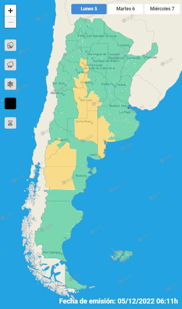 El nivel de alerta amarillo implica "posibles fenómenos meteorológicos con capacidad de daño y riesgo de interrupción momentánea de actividades cotidianas", recordó el Servicio Meteorológico Nacional.