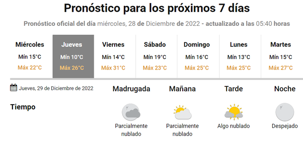 Para el jueves se espera que el tiempo mejor, con sol, más allá de alguna presencia nubosa y una temperatura máxima de 26 grados.