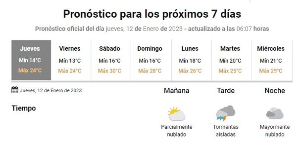 El Servicio Meteorológico Nacional (SMN) prevé para este jueves 12 de enero en Villa Gesell tormentas aisladas por la tarde, vientos fuertes del sudeste con ráfagas y una temperatura que irá de los 14 a los 24 grados.