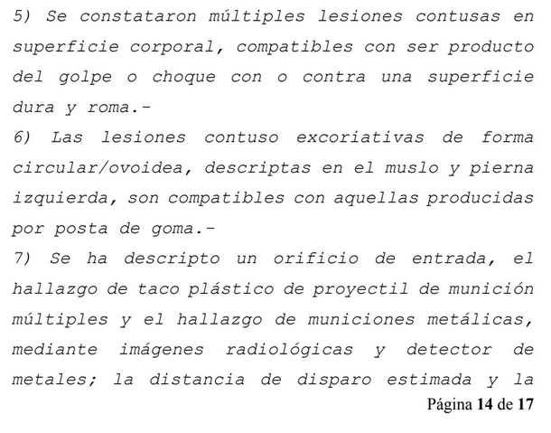 En detalle, el estudio reveló que “se constataron múltiples lesiones contusas en superficie corporal, compatibles con ser producto del golpe o choque con o contra una superficie dura y roma”. Además, “las lesiones contuso excoriativas de forma circular/ovoidea, descriptas en el muslo y pierna izquierda, son compatibles con aquellas producidas por posta de goma”.